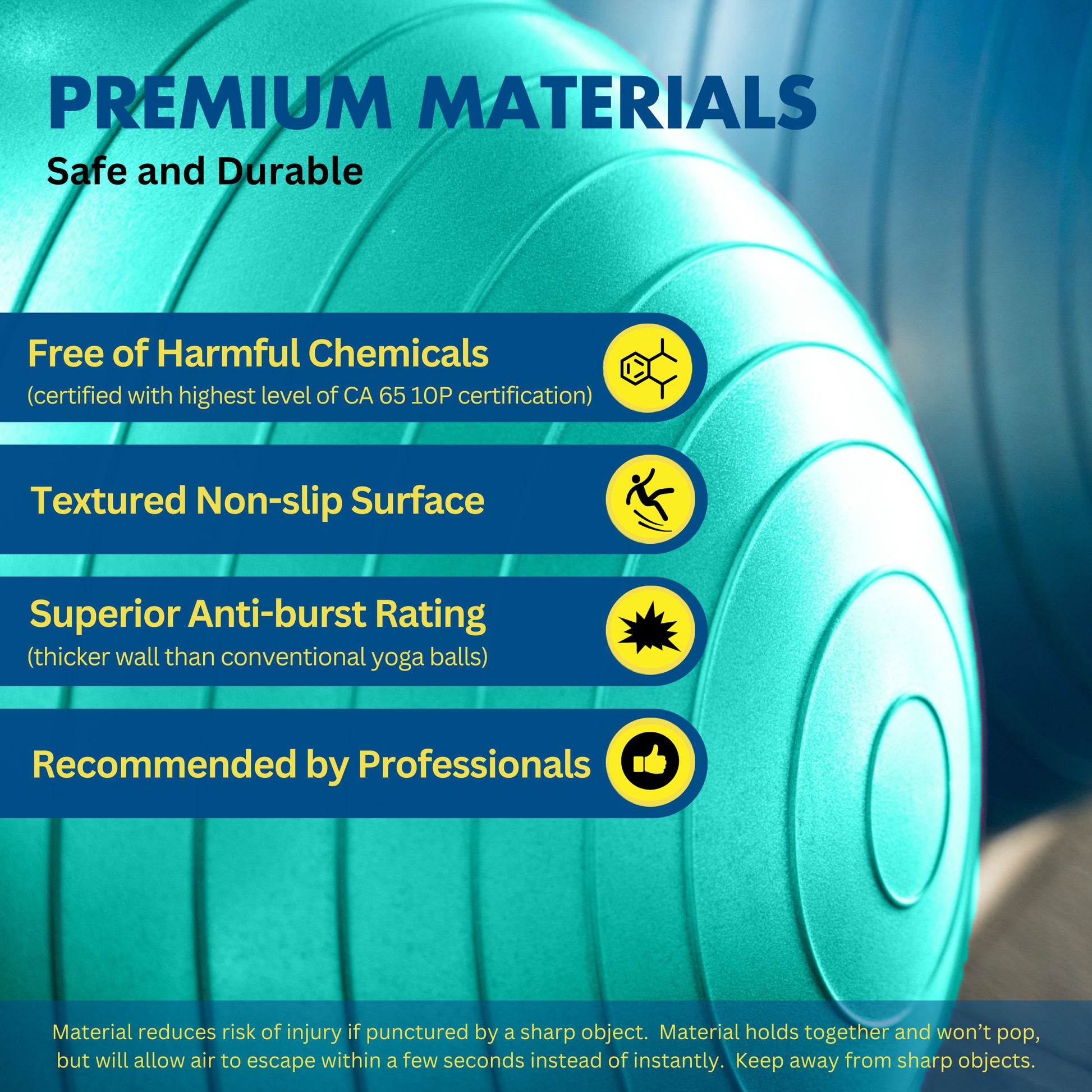 - IMPROVED PERFORMANCE: The exercise ball large is designed with anti-burst technology, and a higher weight capacity exceeding 450 lbs. Complies with CA 10P certification, stricter standard than standard yoga balls.