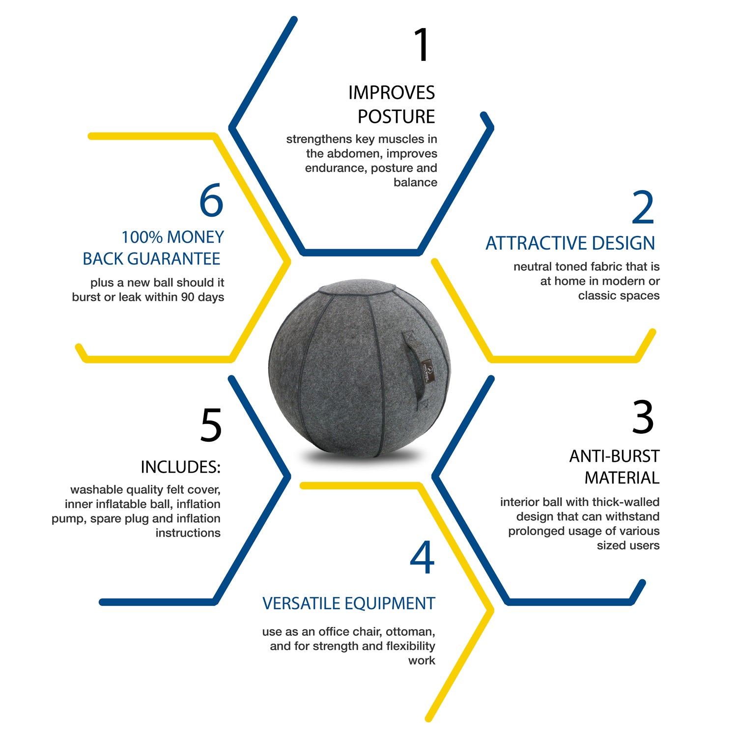 - CLEAN DESIGN AND ATTRACTIVE - Our ball seat has a geometric appeal that is at home in modern or classic spaces. The neutral-toned fabric upgrades an exercise ball into a cozy fine piece of furniture. Your new stability ball chair helps with good posture when used as a yoga chair or exercise ball chair.